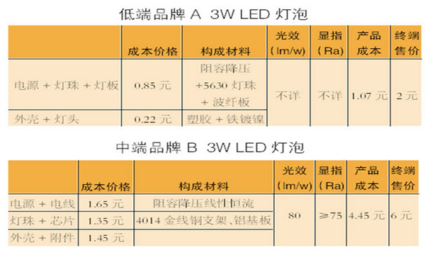 從圖中,可以看到低端3WLED燈泡電源使用的是阻容降壓、5630的燈珠、玻纖板的燈板,成本價只需1.07元,可光效、顯指這些參數卻不得而知。而中端3WLED燈泡的材料是阻容降壓線性恒流的電源電線,4014金線銅支架、鋁基板,成本價比低端產品的高出了3倍,80lm/w的光效等參數皆有。明顯的中端產品各部件材料價格都比低端產品高出幾倍,從而終端售價也高了4元。