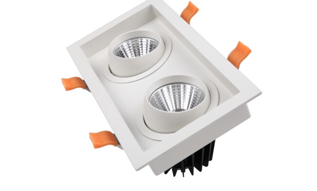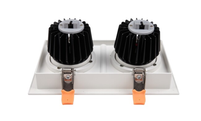 1、G14系列雙頭COB格柵射燈燈體采用優(yōu)質(zhì)鋁合金噴涂處理,散熱好,面框為鋁合金沉臺設計,外觀新穎、時尚